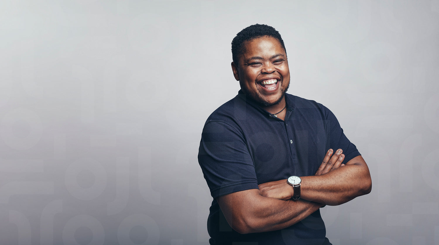 Strong african man standing against grey background looking at camera. Portrait of laughing african man standing with arms crossed.