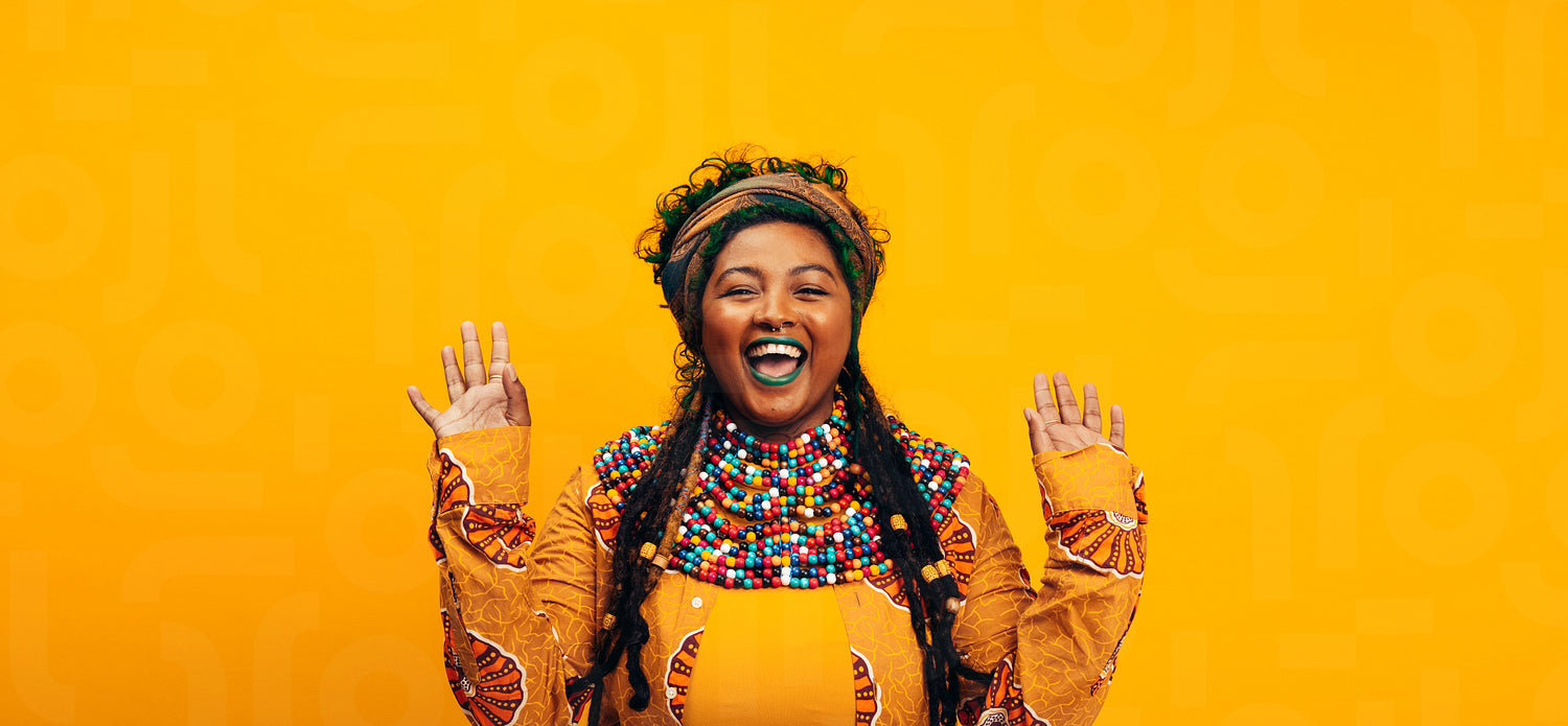 Cheerful ethnic woman wearing traditional clothing. Fashionable young woman smiling at the camera while standing against a yellow background. Stylish young woman wearing a colourful bead necklace.