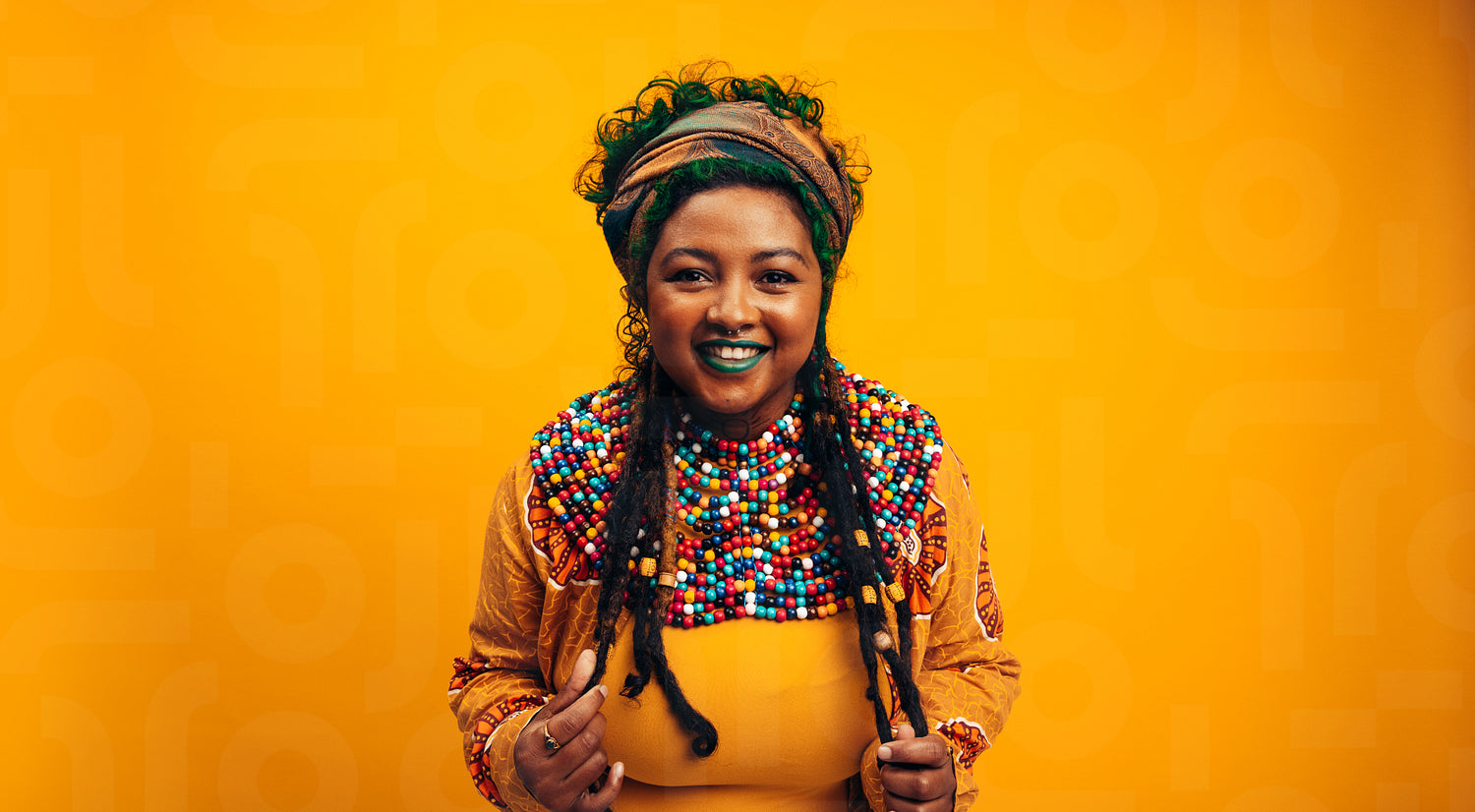 Happy young woman wearing African clothing. Fashionable young woman smiling at the camera while standing against a yellow background. Stylish young woman wearing a colourful bead necklace.