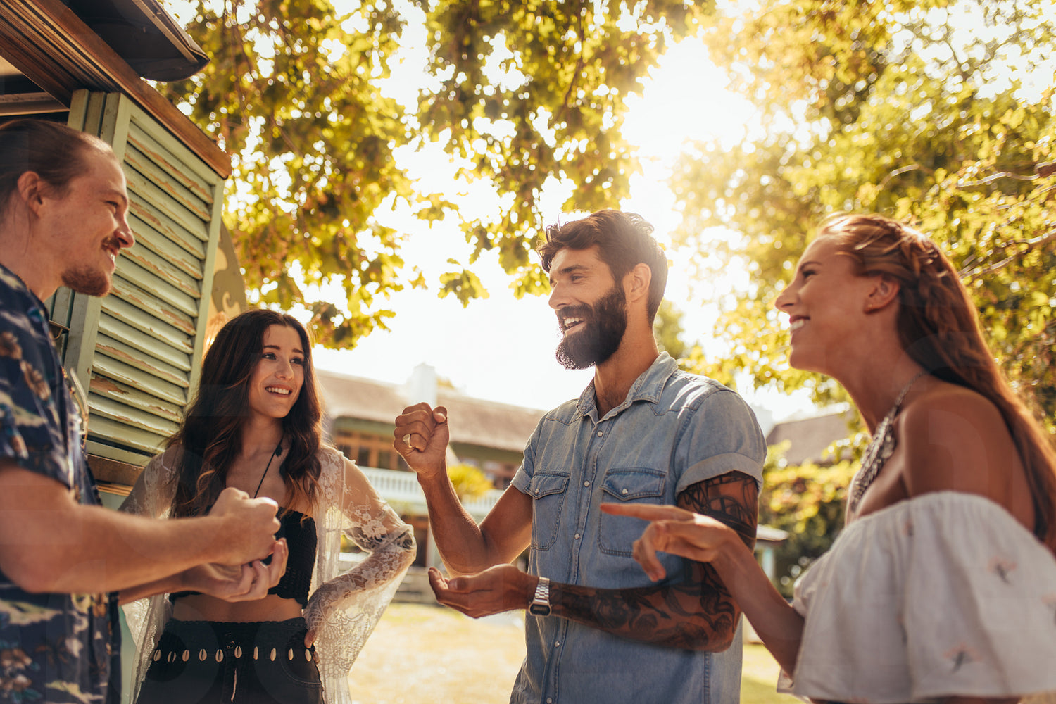 Friends gathered for a summer music festival outdoors. Group of men and women standing together and talking at festival.