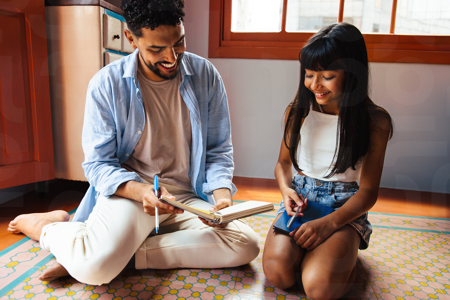 A heartwarming scene of a Latin American father and his daughter engaging in an educational activity. They are bonding through a shared task, demonstrating care, learning, and togetherness.