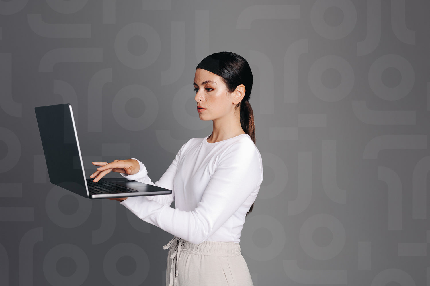 Professional woman using a laptop while standing against a studio background