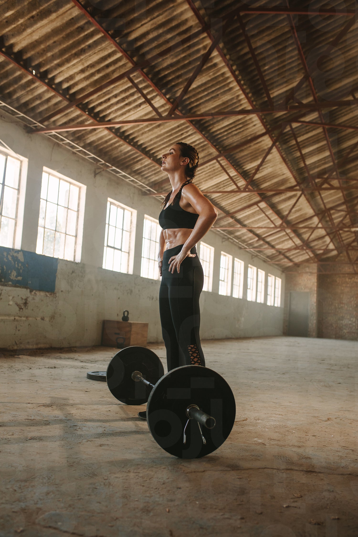 Female taking rest after physical training at cross training space in an abandoned factory. Woman after training at old warehouse.