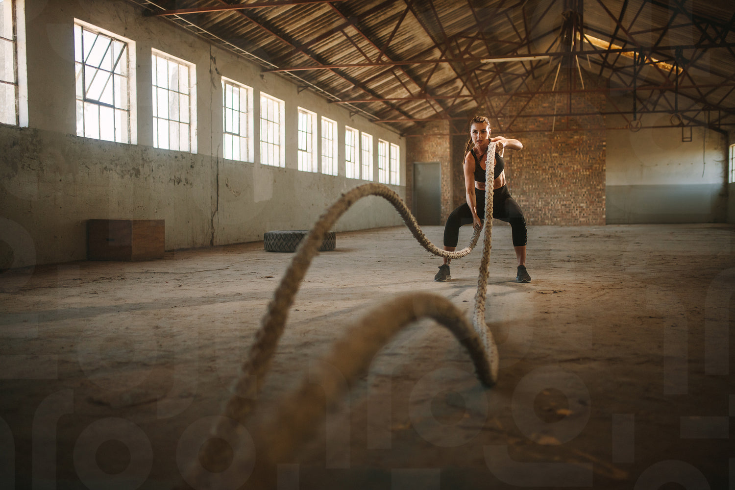 Fitness woman workout with battle ropes inside abandoned warehouse. Muscular female doing battle rope workout.