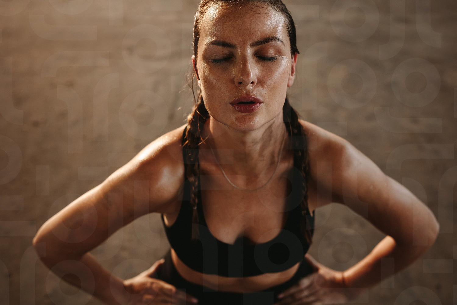 Fit woman with her hands on her hips taking deep breathe. Female athlete taking break after intense workout.