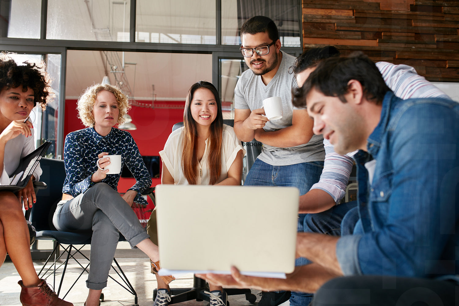 Team of creative people looking at colleague showing project plan on his laptop. Diverse group of young people having a meeting at the office. They are discussing about new project.