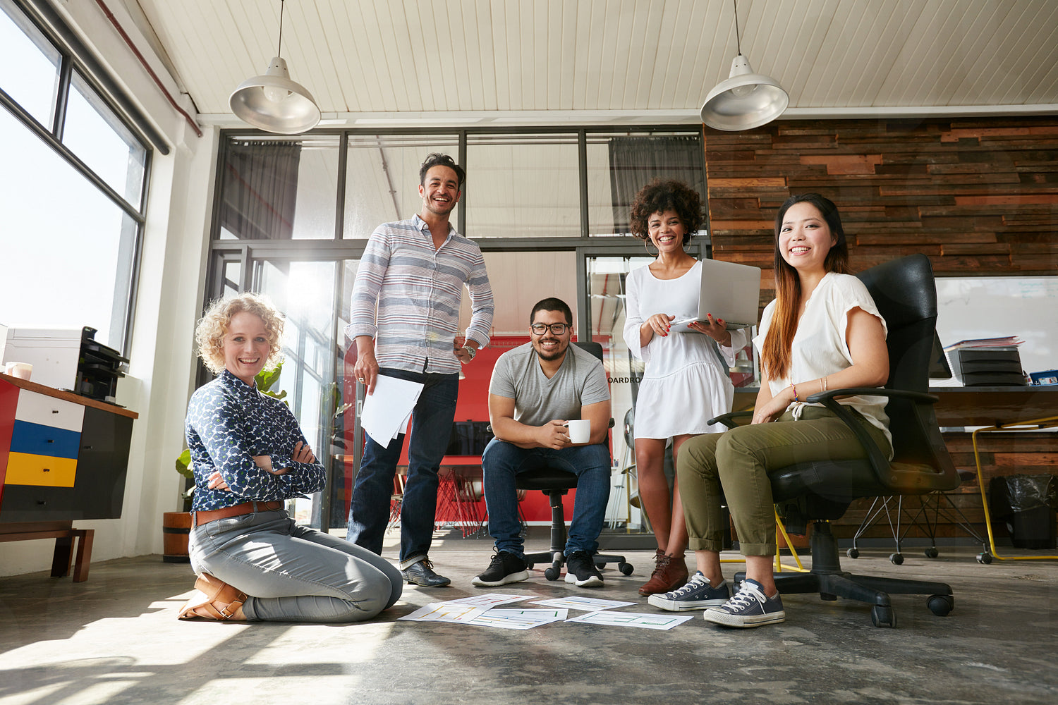 Portrait of happy young people in a meeting looking at camera and smiling. Young designers working together on a creative project.