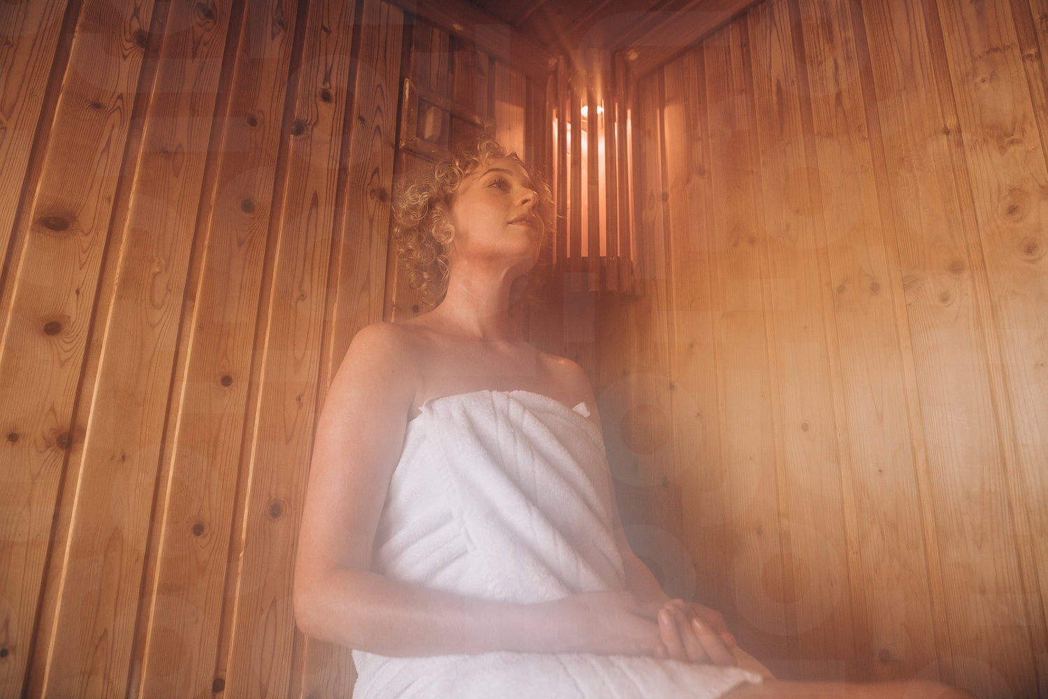 Woman sitting in spa wearing a towel taking steam bath. Woman relaxing in a spa.