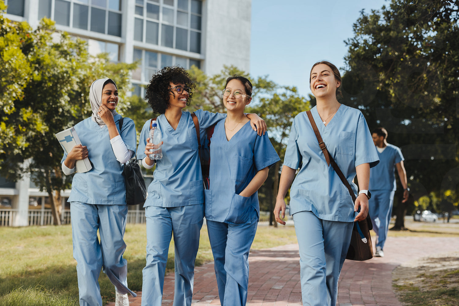 Female medical students from different cultural backgrounds smile as they walk together after a training class. Group of intelligent young women wearing scrubs in medical school.