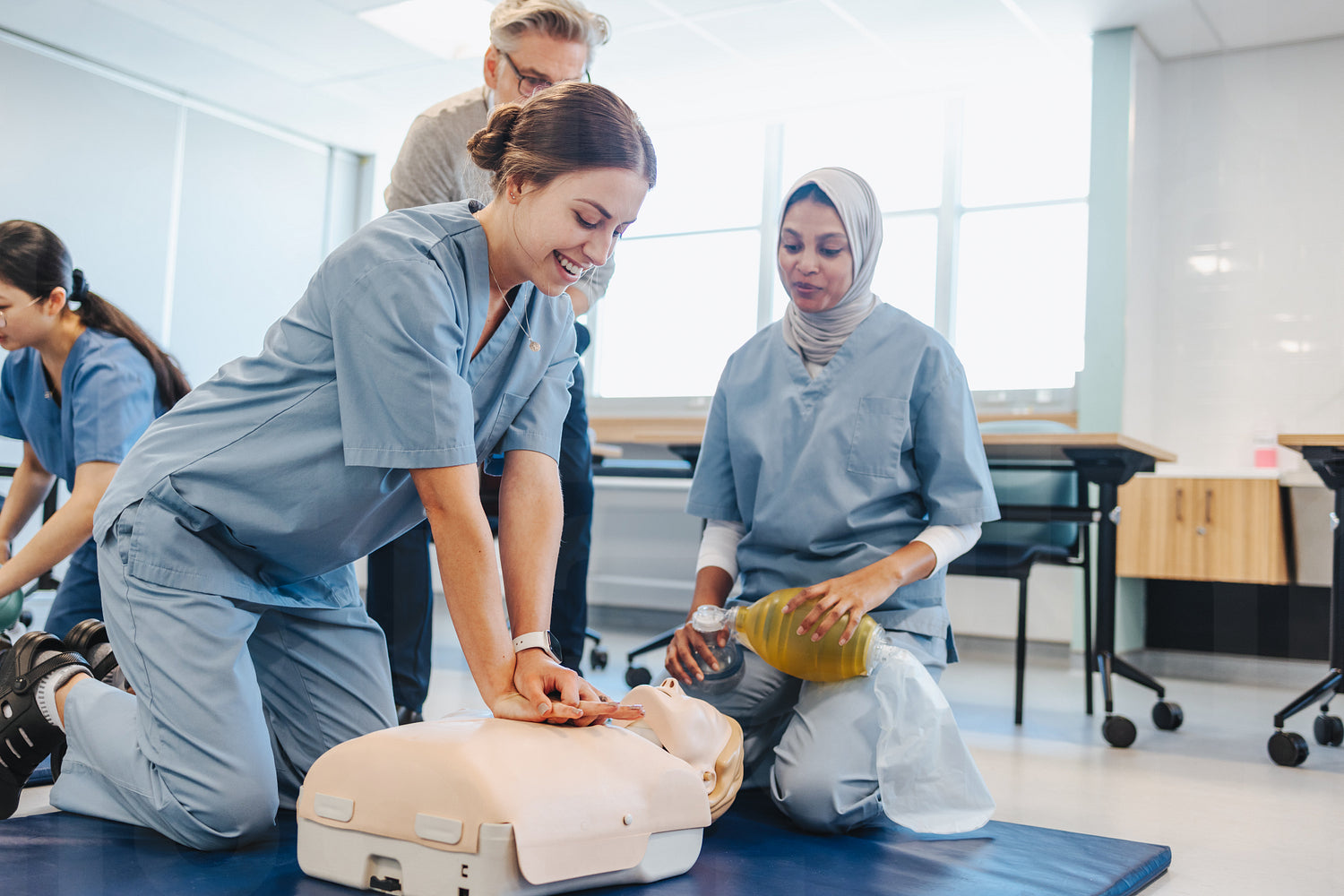 Female students wearing scrubs practice CPR on a dummy under a senior doctor’s supervision. Two young women participating in medical simulation training at a teaching hospital.