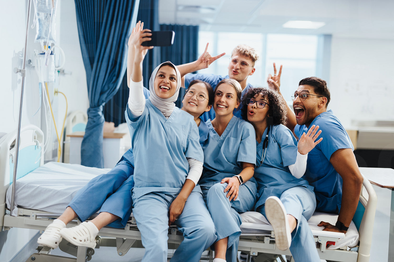 Group of nursing and medical students taking a celebratory selfie in a hospital