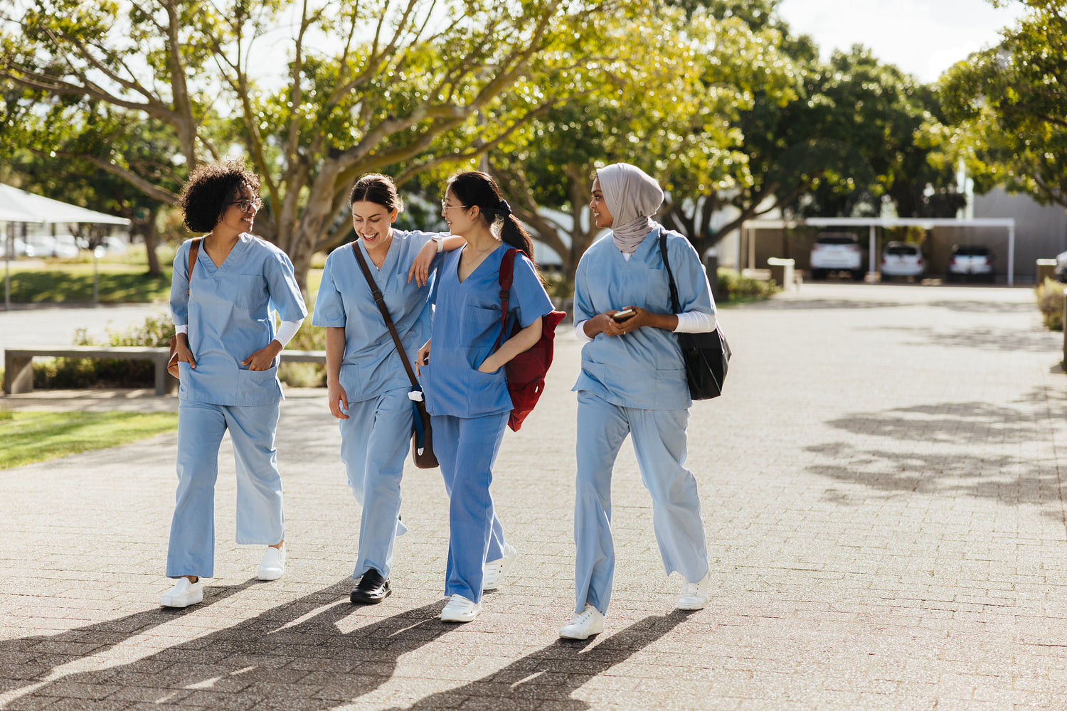 Female medical students going to class in scrubs, chatting as they walk together on campus. Group of multicultural healthcare students doing their medical residency at a teaching hospital.