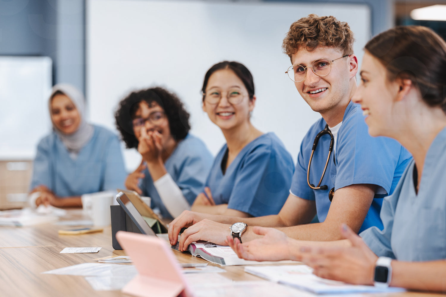 Multicultural healthcare team meeting in a study hall. Medical students and researchers from a university hospital happily sit together in scrubs discussing their latest project with enthusiasm.