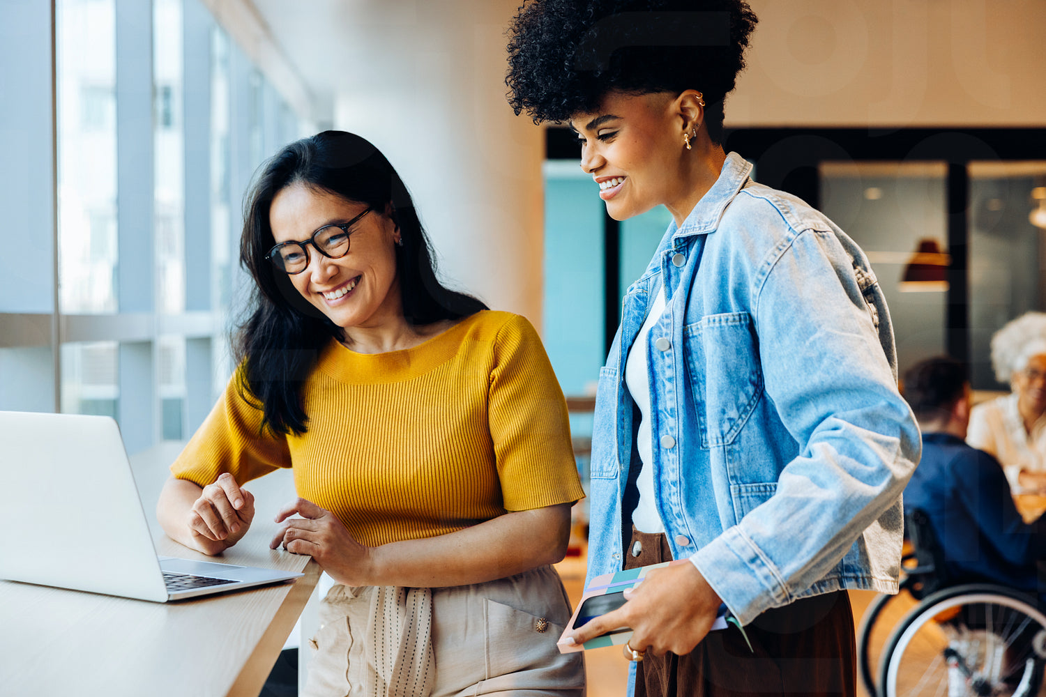 Two women work together at a laptop in an office, one seated typing while the other stands with papers, sharing ideas and smiles.