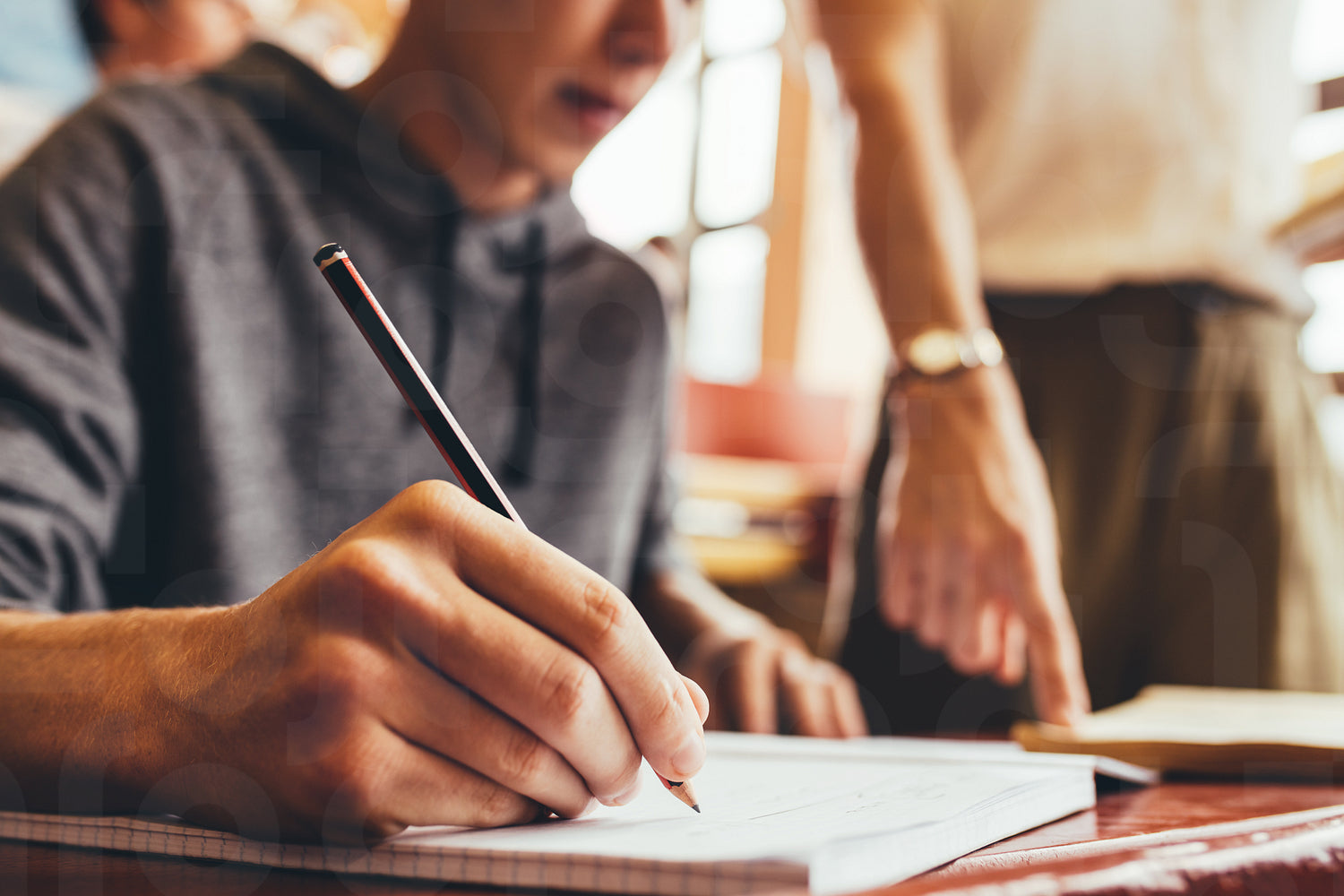 Close up of teenage boy writing notes sitting at desk during lecture with female teacher pointing at a book. Focus on hand writing in book in classroom.