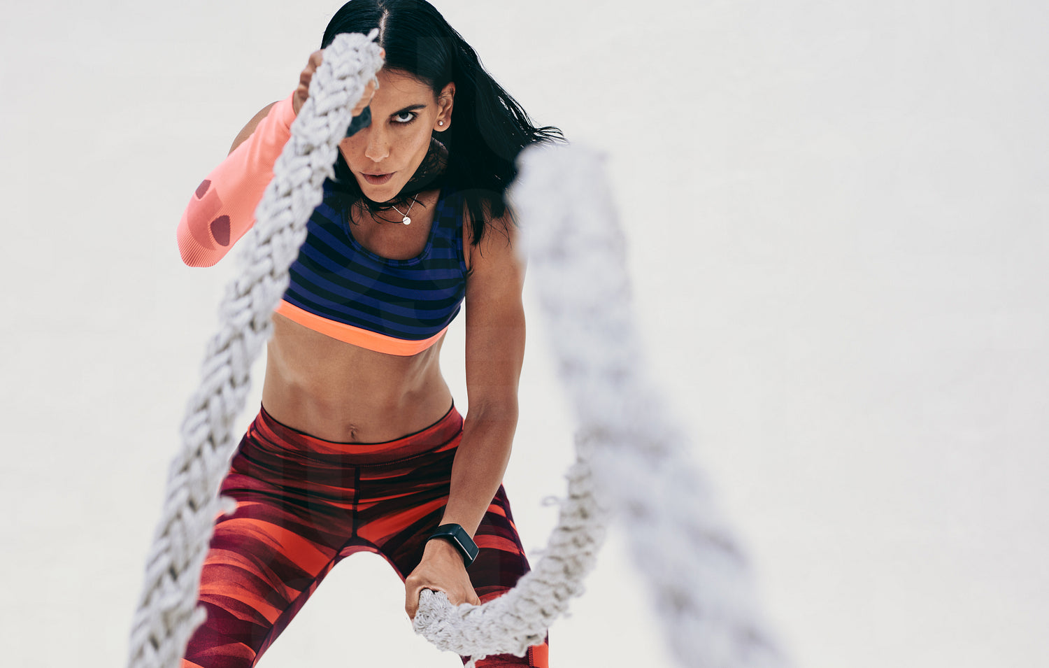 Close up of a fitness woman working out using battle ropes