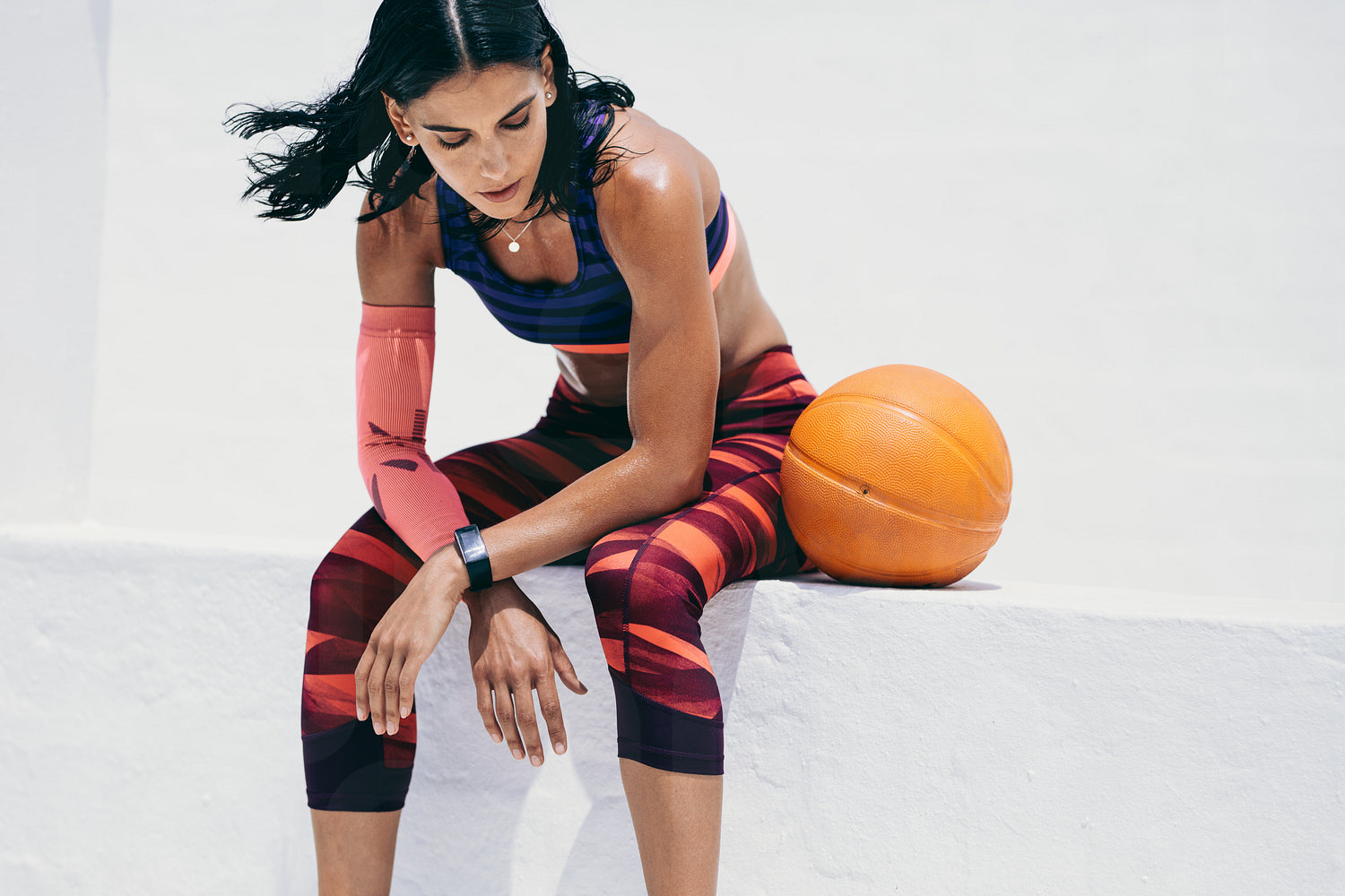 Fitness woman relaxing after workout sitting with a basketball beside her. Woman in fitness wear sitting and relaxing during workout.