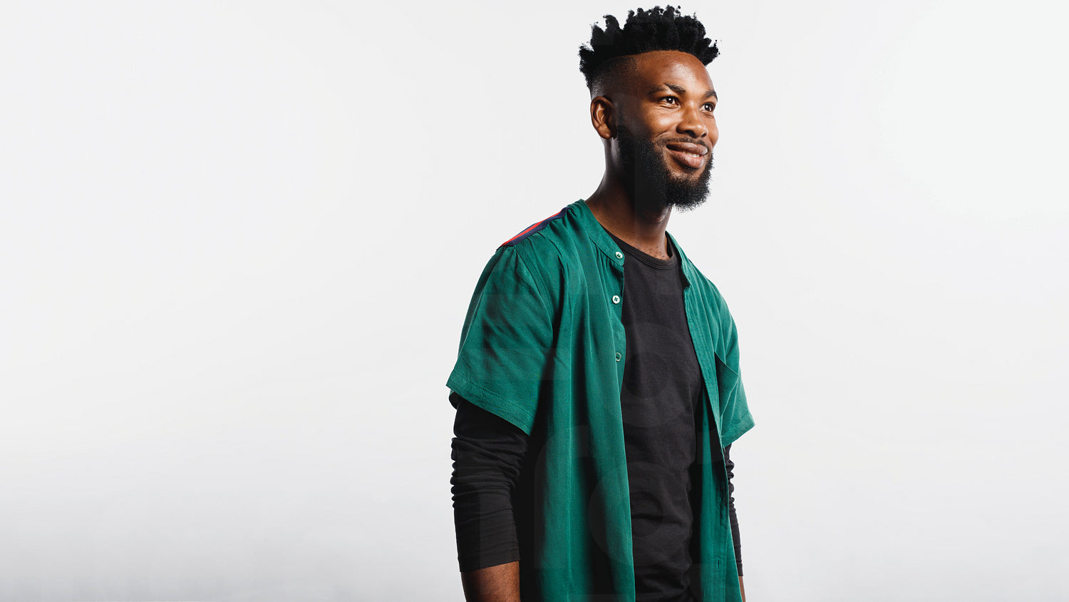 Portrait of cheerful african man looking away. African man with beard and funky hair style standing against white background.