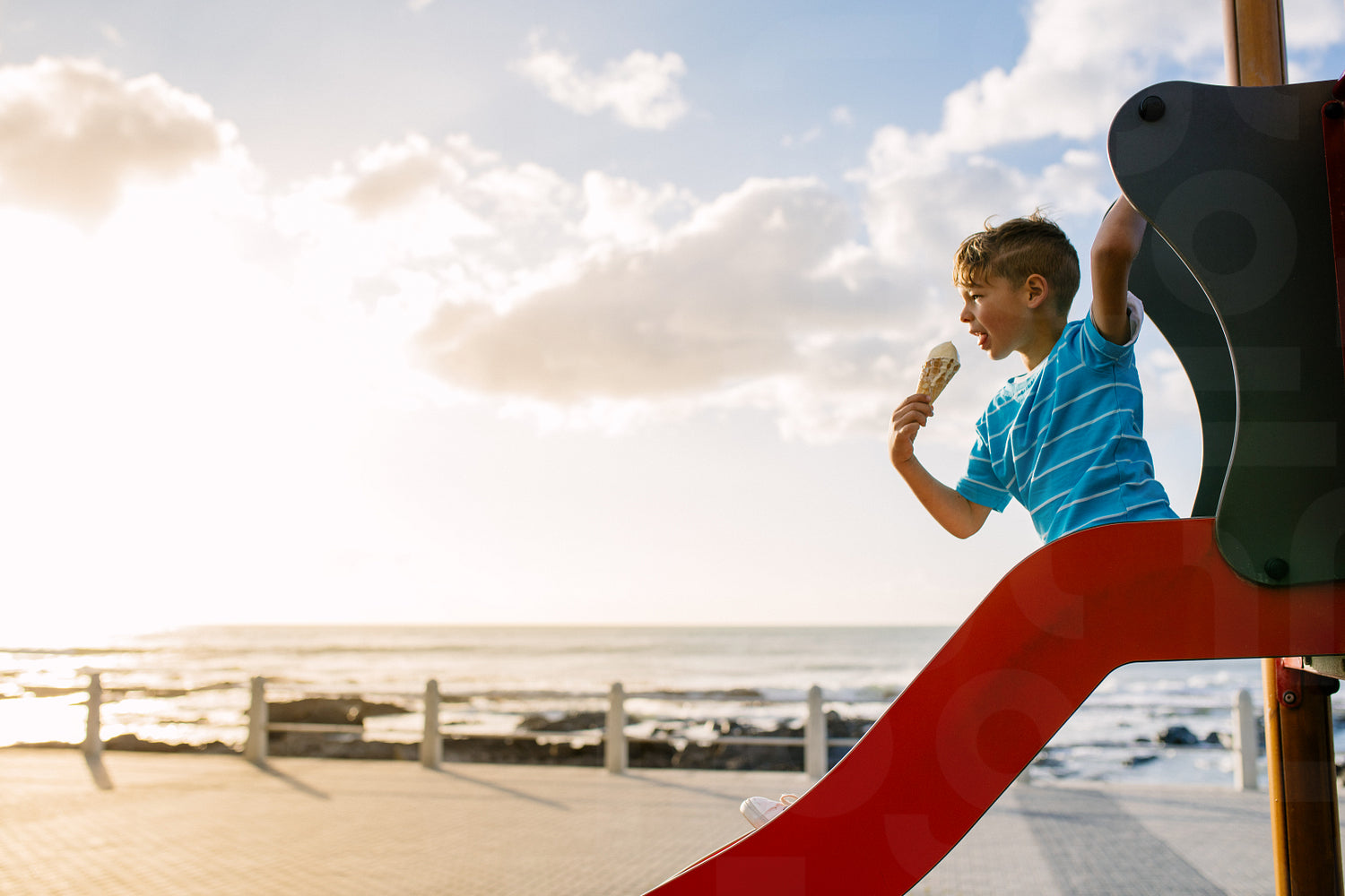 Boy eating an ice cream sitting on a slide at the seafront on a sunny evening. Little boy on vacation treating himself to an ice cream.