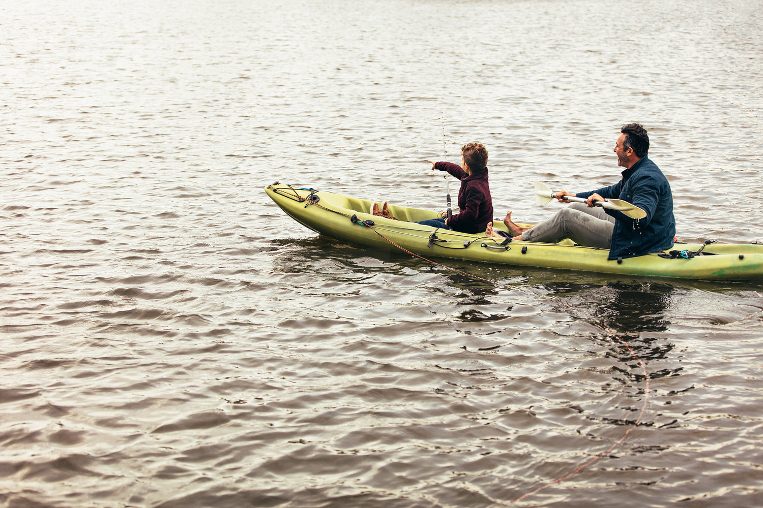 Happy father and son fishing in a lake sitting in a kayak. Kid fishing with a fishing rod while his father rows the boat.
