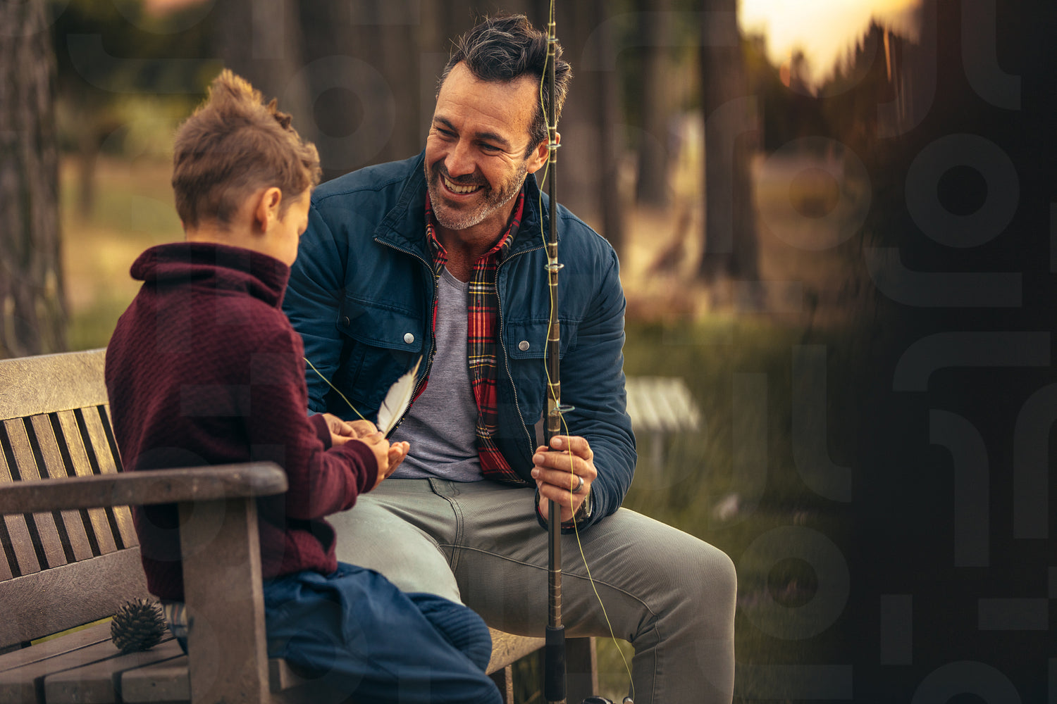 Cheerful father and son sitting outdoors on a bench with a fishing rod. Smiling man talking to his son holding a fishing rod.