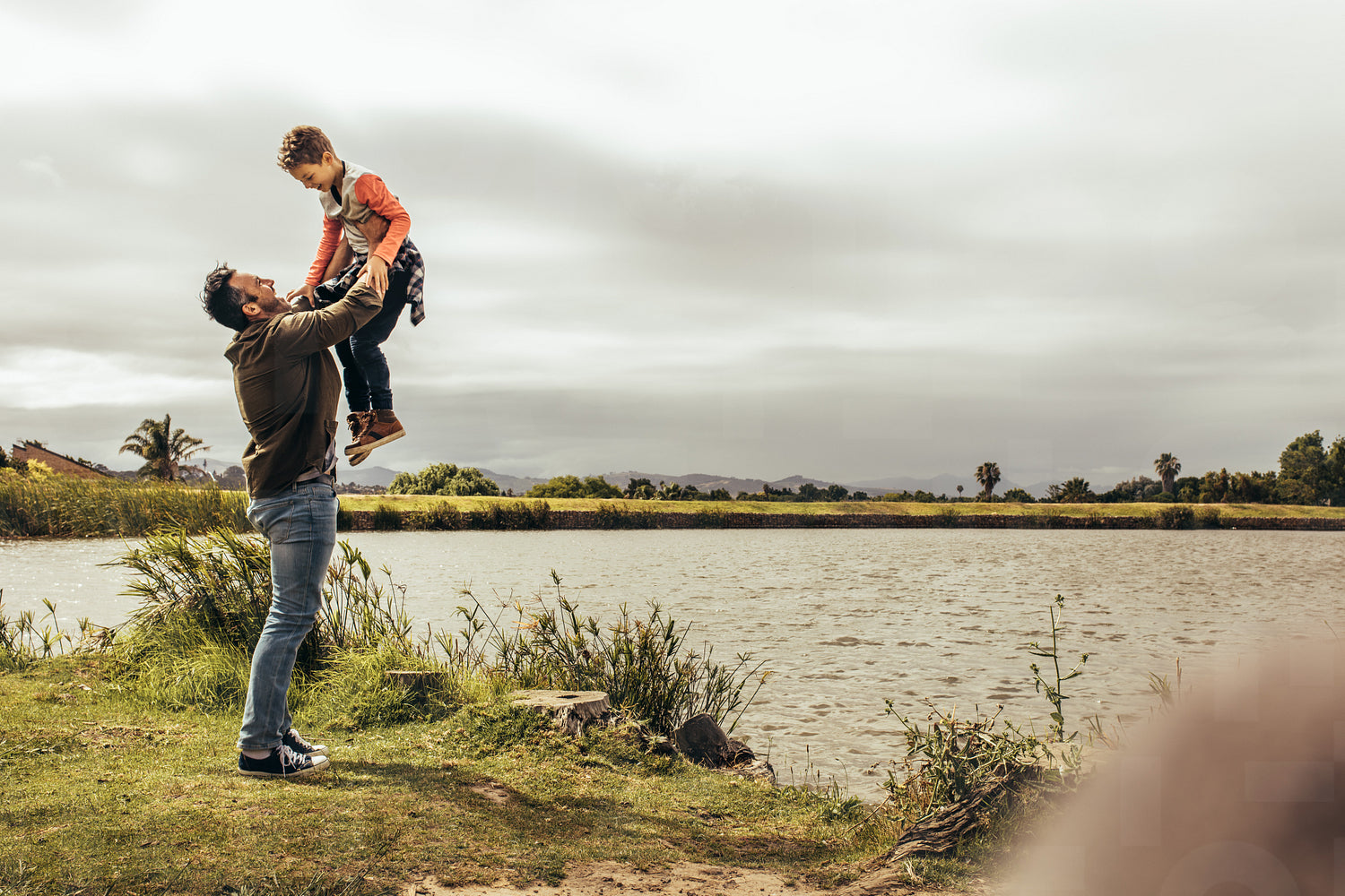 Father and son having fun spending time together outdoors. Man lifting his son high playing with him standing near a lake.