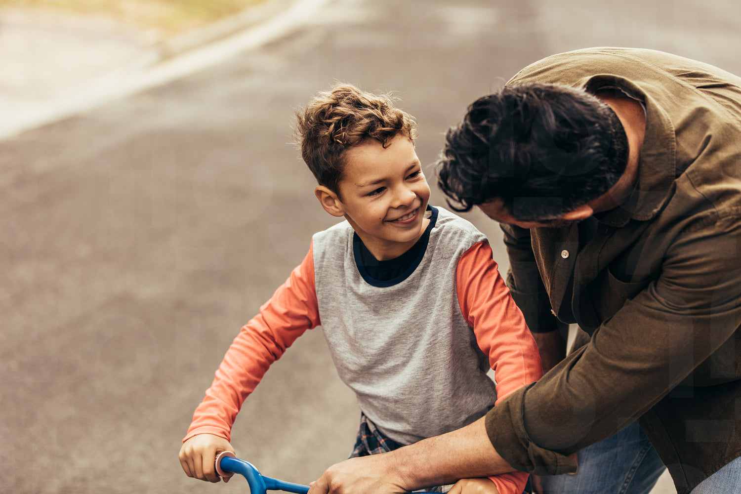 Father instructing his son on riding a bicycle. Man helping his son to learn to ride a bicycle.