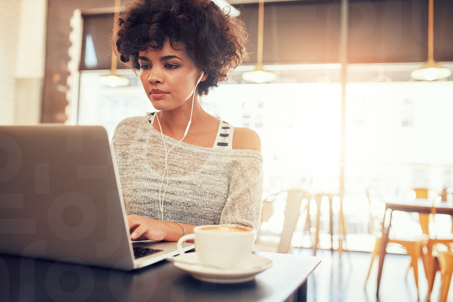 Portrait of beautiful young woman with earphones working on laptop while sitting at a coffee shop. African female at a cafe surfing internet on laptop.