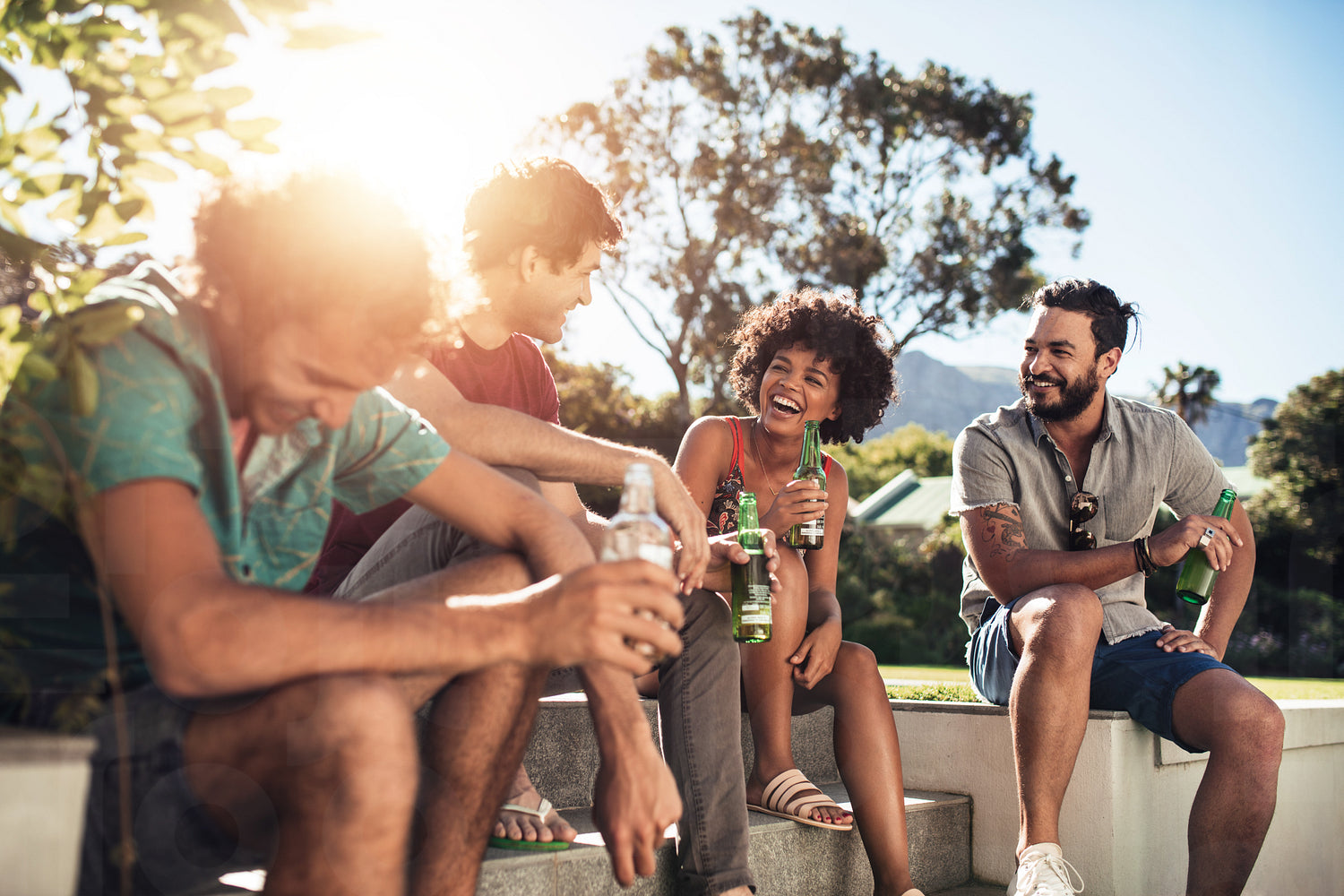 Outdoor shot of young people having a party outside. Best friends hanging out and having beers.