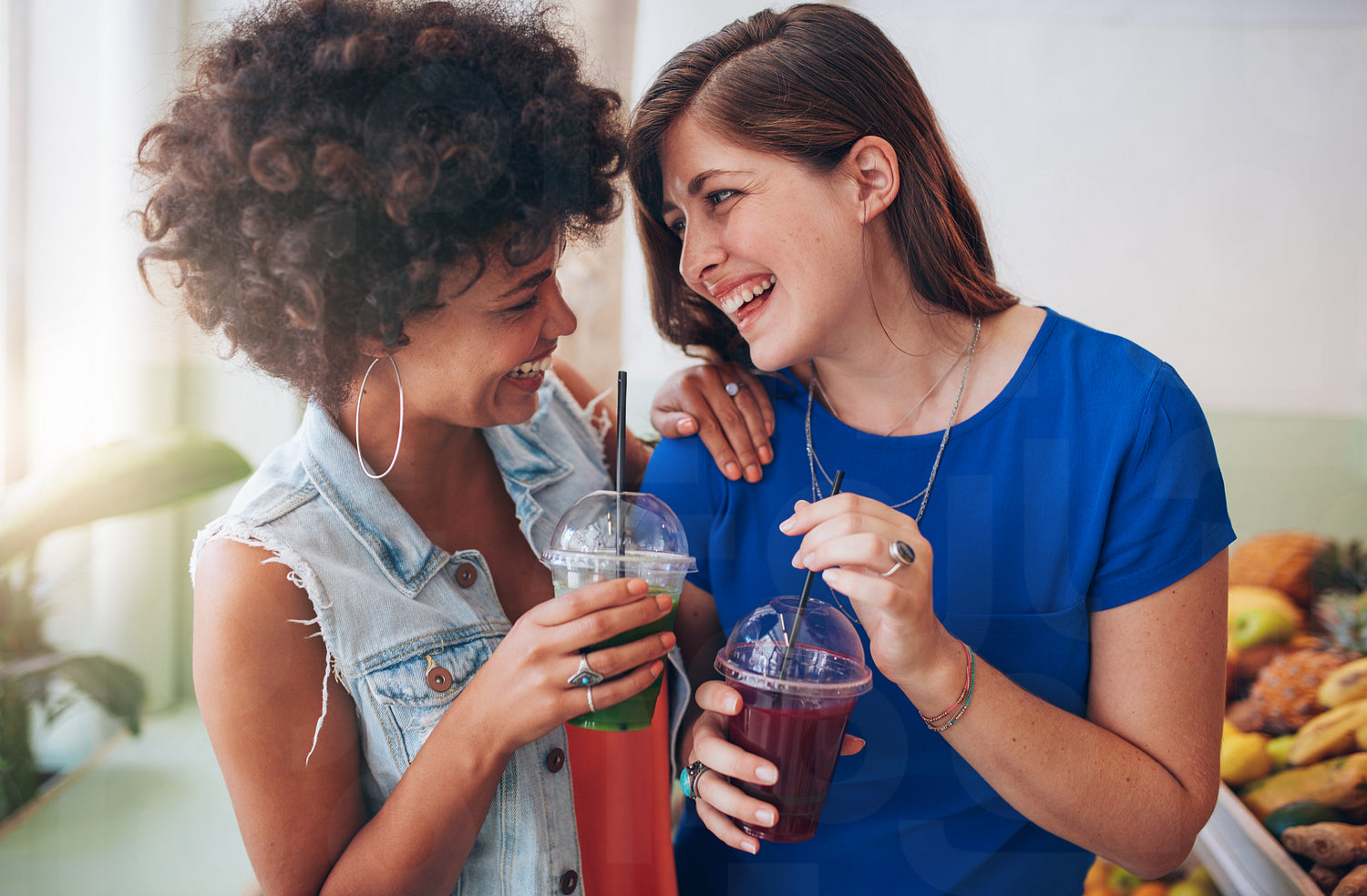 Portrait of cheerful young friends having fresh juice. Two young women at juice bar having a glass of fresh fruit juice together.