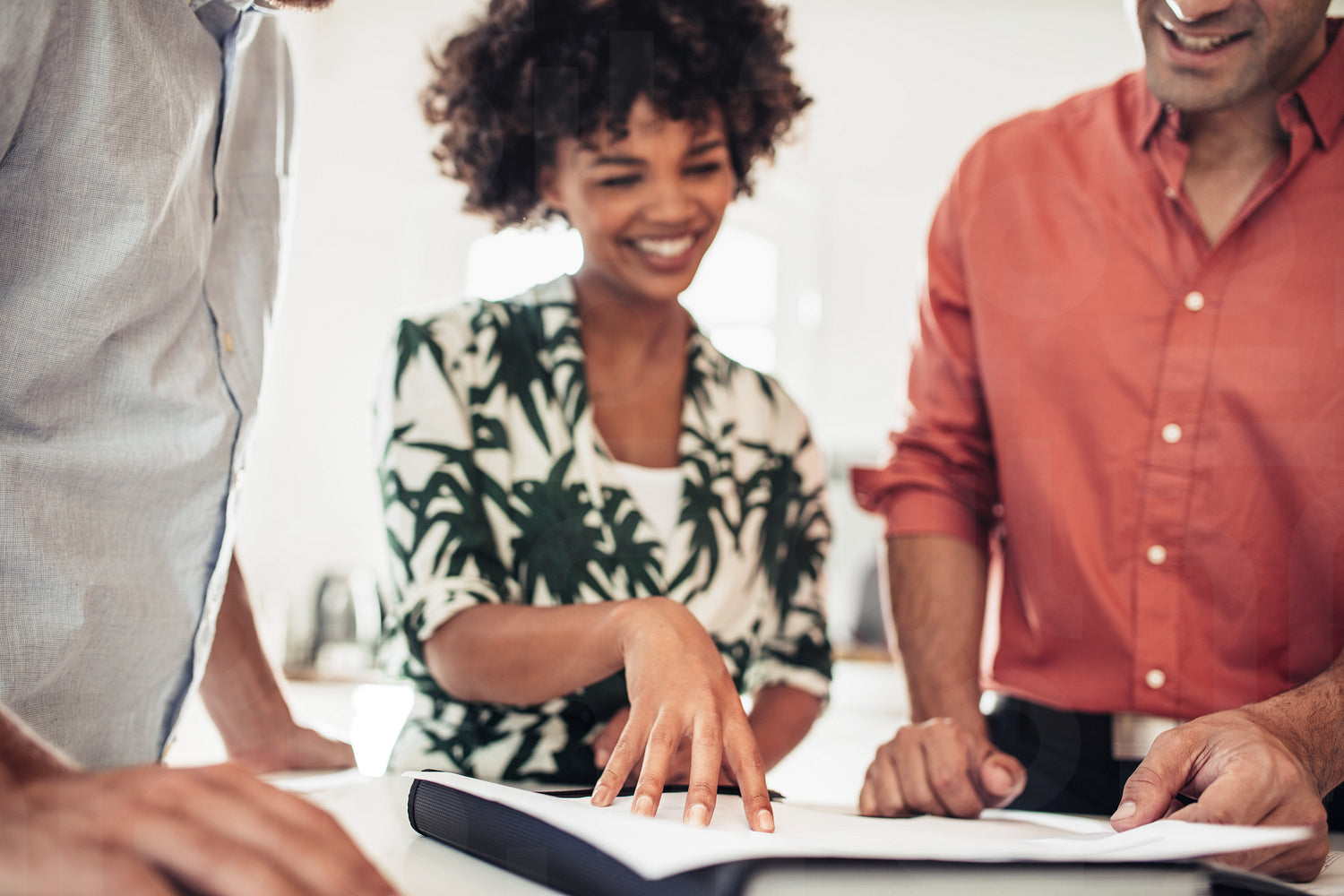 Young couple with real estate agent discussing property documents. Couple reviewing contract papers with estate broker.