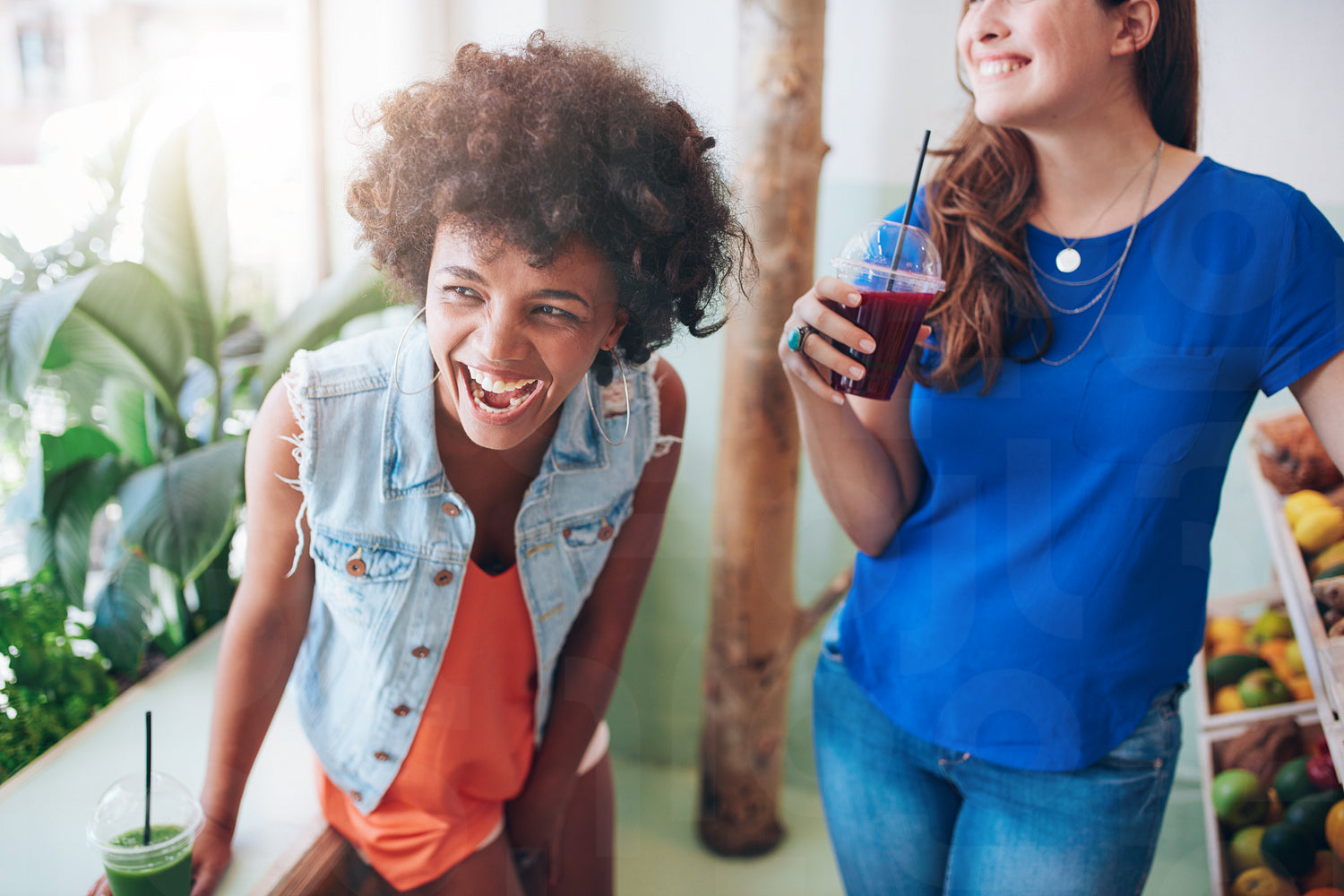Portrait of cheerful young women at juice bar having a glass of fresh juice. Friends enjoying a juice bar.