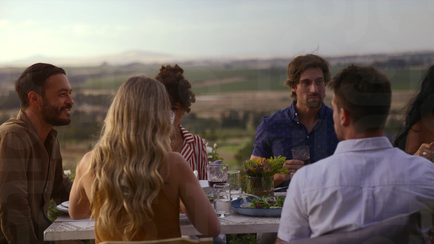 Smiling group of friends eating food and talking at dinner party. Cheerful people enjoying having food together at a party.