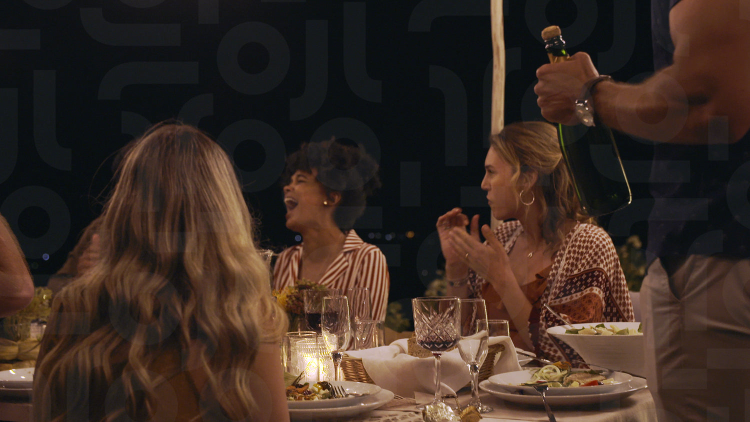 Group of men and women chatting at an outdoor dinner party and laughing. Millennials having fun at party in evening.
