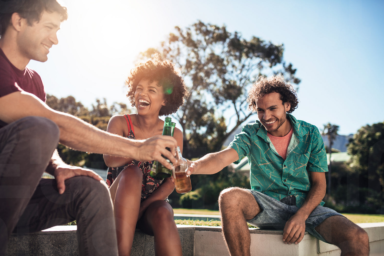Group of friends having fun with drinks outdoors in garden. Group of people hanging out and toasting beers outdoors.