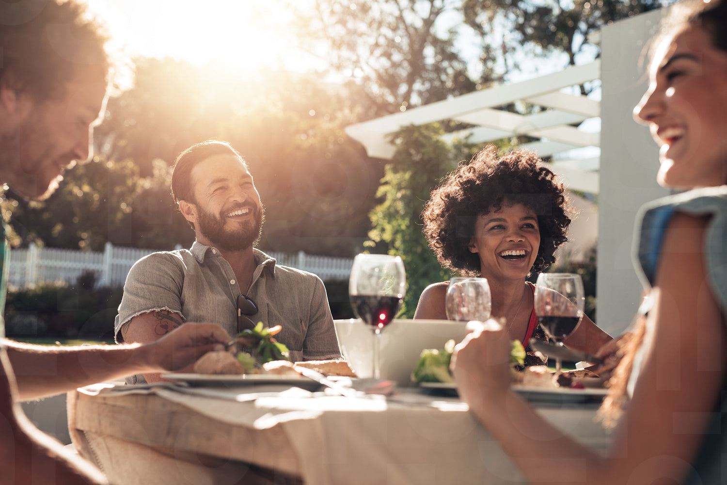 Group of young friends enjoying outdoor summer meal. Young men and women having meal together outside in garden.