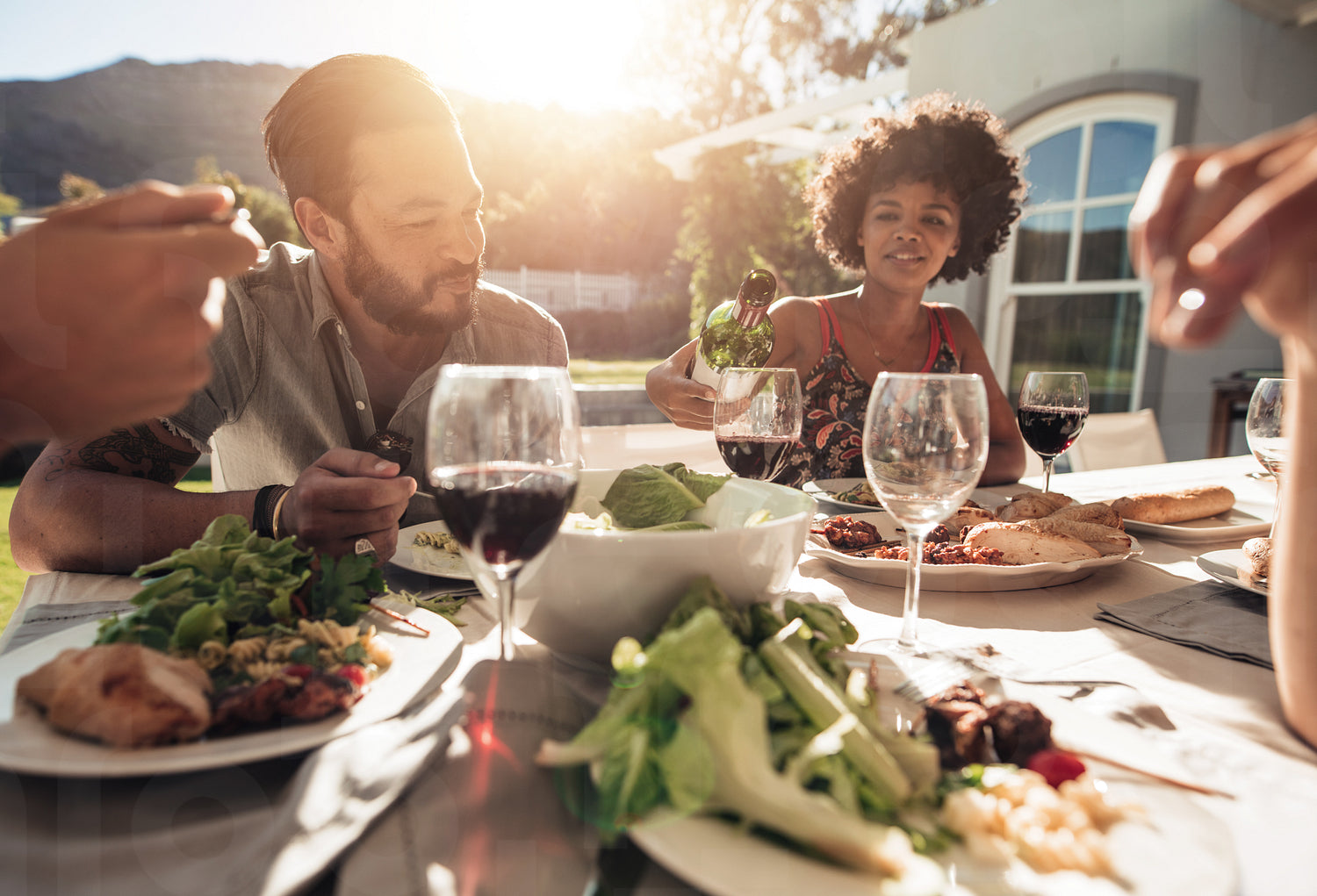 Group of people having meal outdoors with woman serving wine to man. Friends having party outside house.