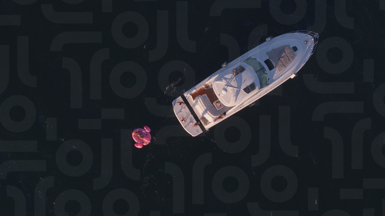 Aerial shot of friends diving in the sea from yacht and getting on a inflatable mattress. Group of friends enjoying a summer day sailing and swimming in ocean.
