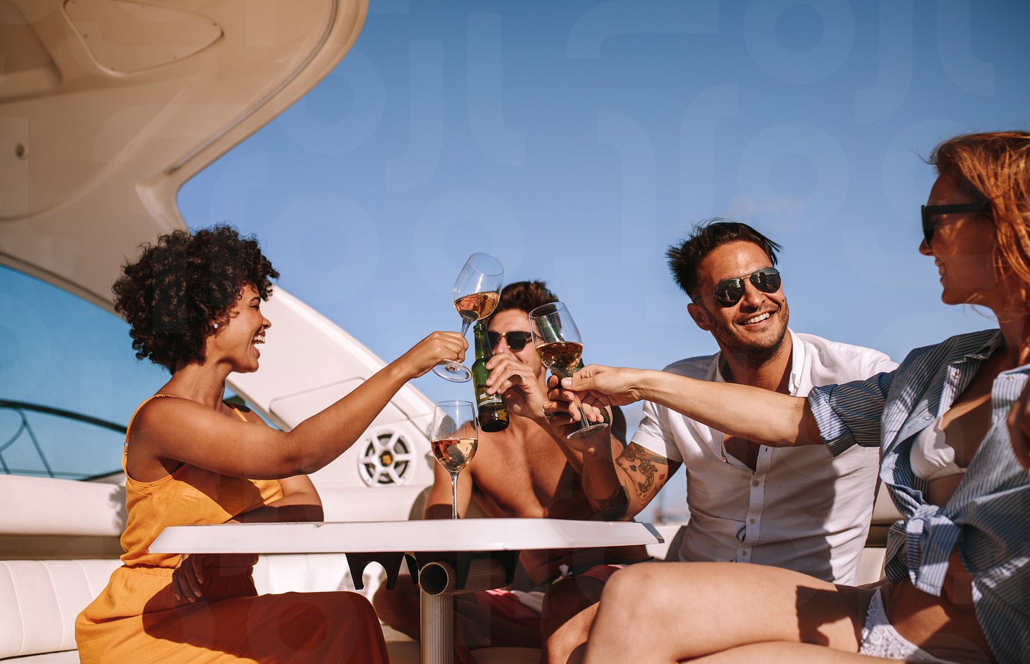Group of young men and women sitting at the back of the boat and toasting drinks. Young people partying on a boat with drinks.