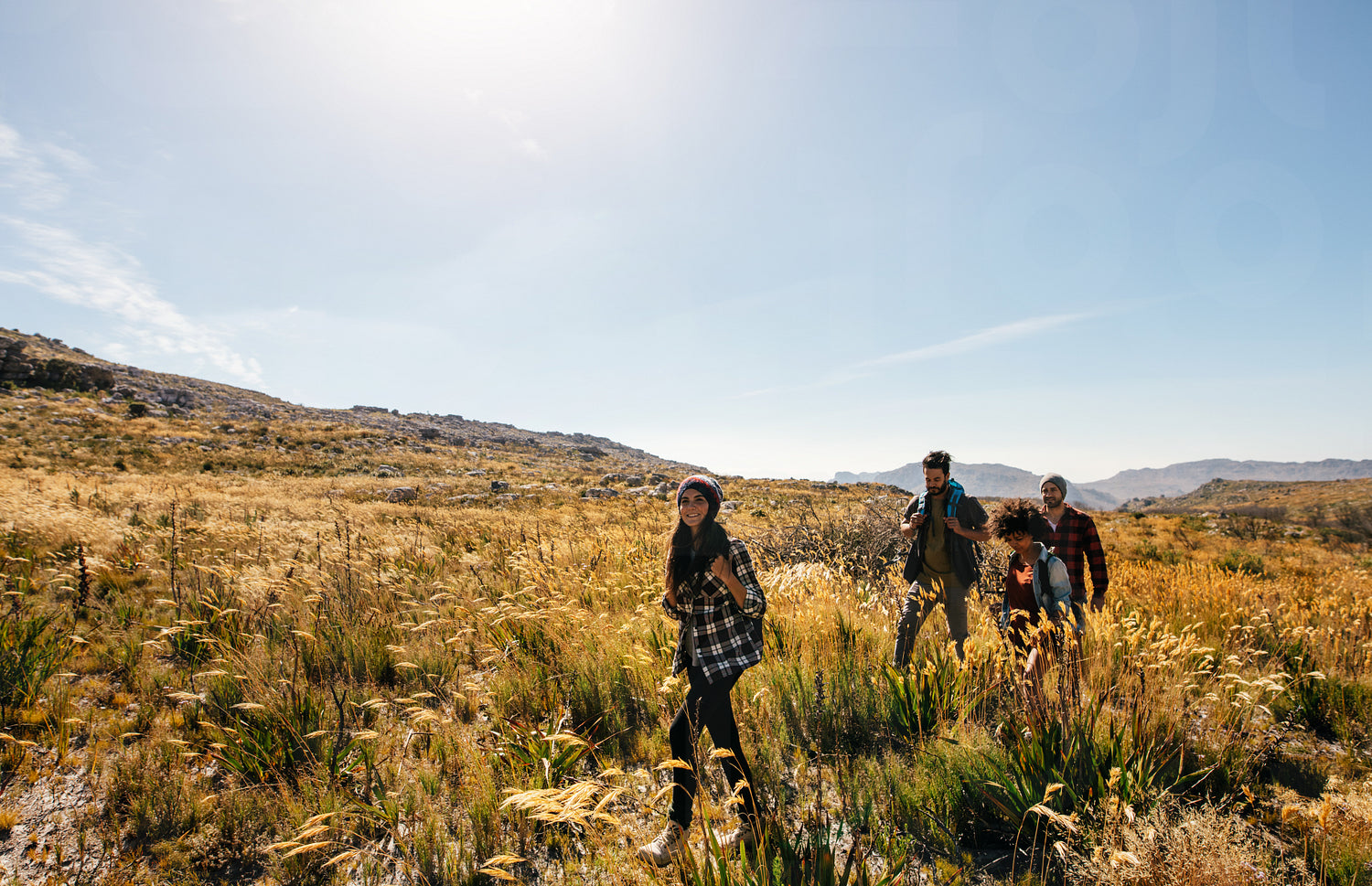 Group of friends are hiking in mountain on a sunny day. Four young people walking through countryside.