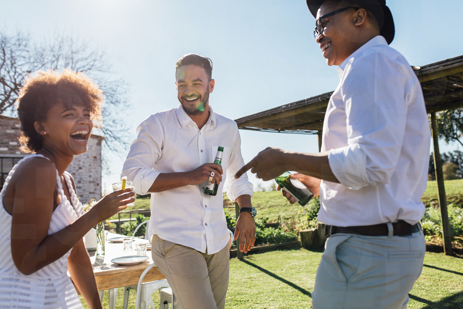 Laughing young people having a party at outdoor restaurant. Group of multiethnic friends enjoying party on a sunny day.