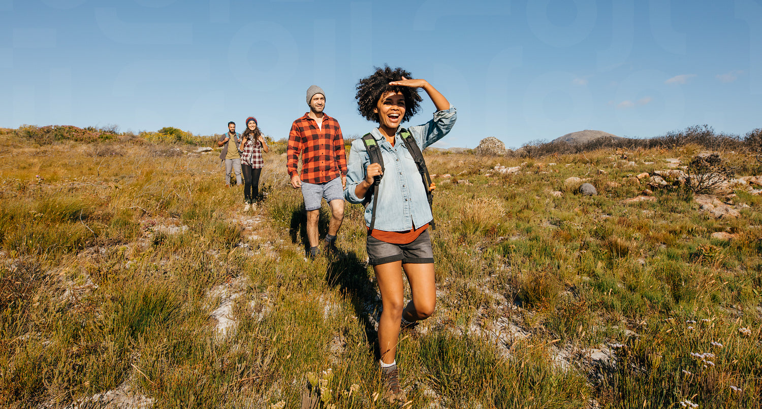 Group of young friends hiking in countryside. Multiracial young people on country walk.