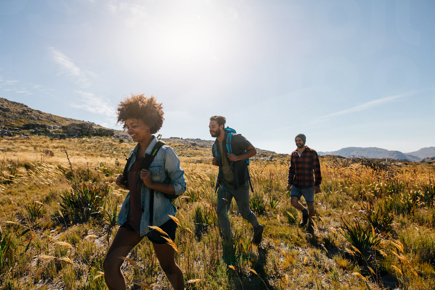 Group of people on walk through countryside. Happy young men and women hiking together on a summer day.