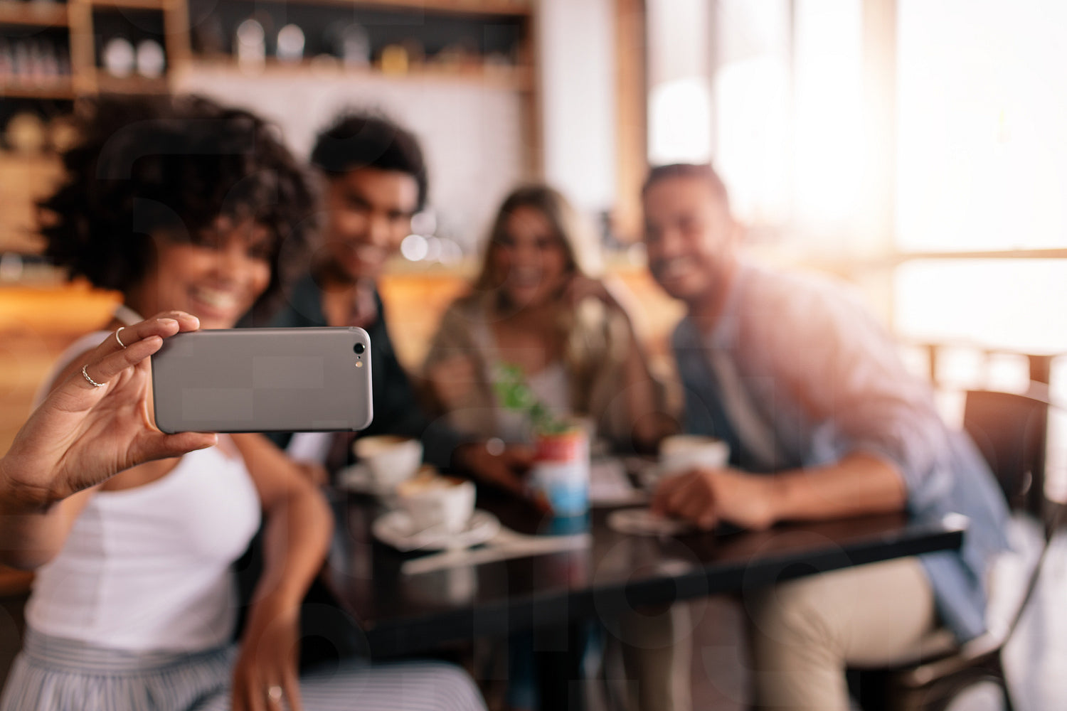 Group of young people sitting at cafe and taking selfie with mobile phone. Focus on mobile phone in hand of a woman sitting with friends at coffee shop.