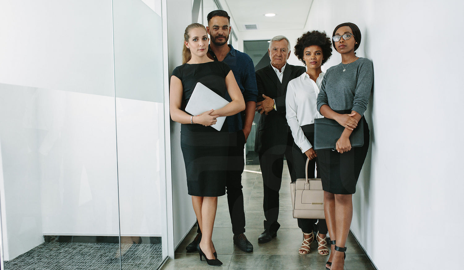 Multi-ethnic group of business people in office corridor