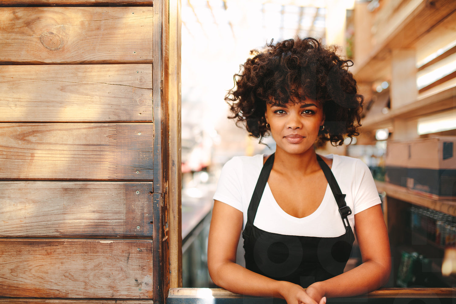 Woman bartender inside her coffee shop. Curly haired woman standing behind the counter of a coffee shop.