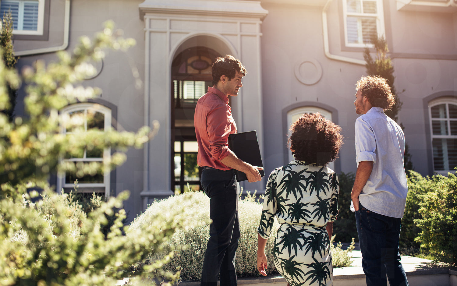 Real estate agent showing a home to a couple. Broker showing modern house to couple.