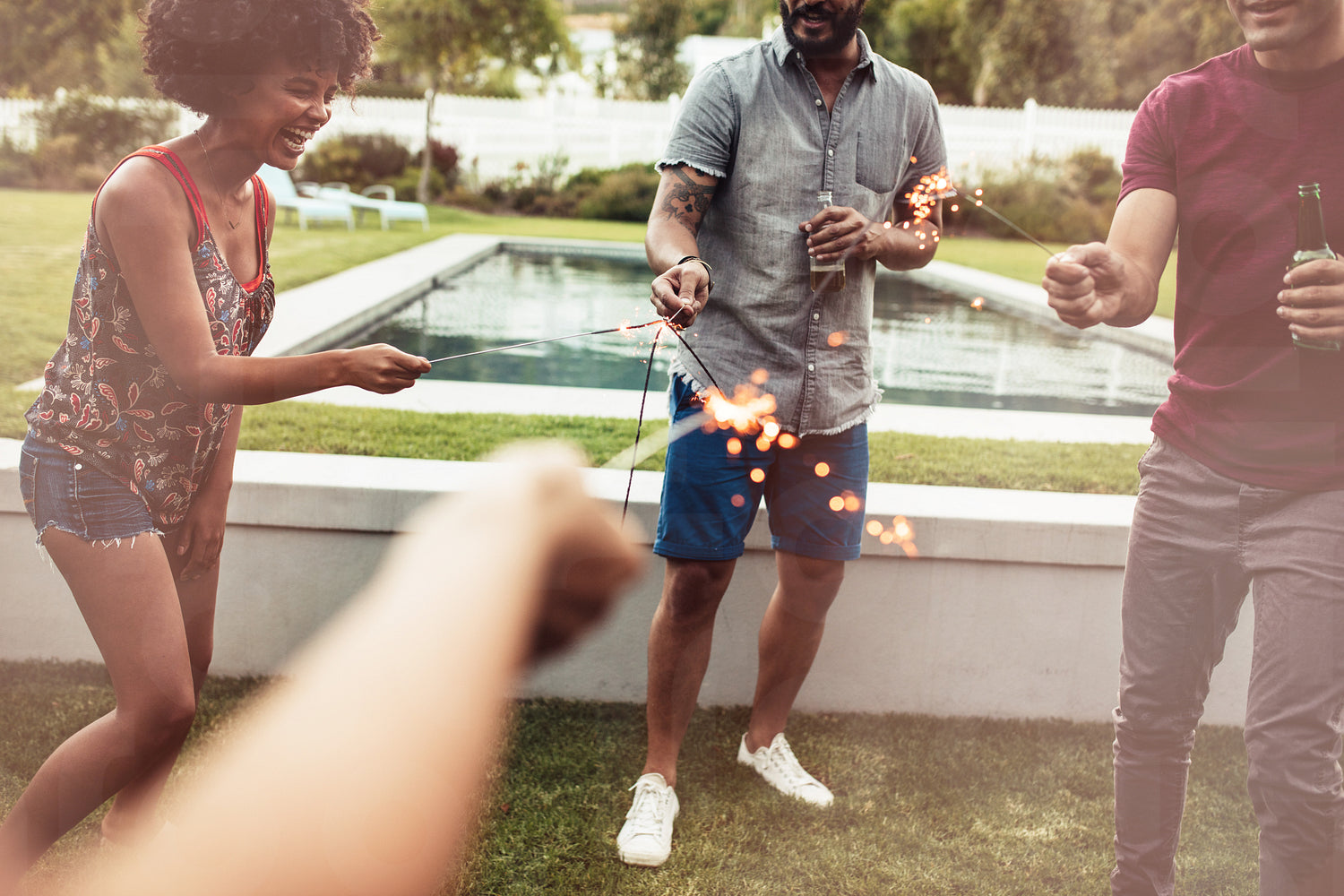 Shot of young people playing with sparklers in backyard. Best friends hanging out and celebrating with fireworks.