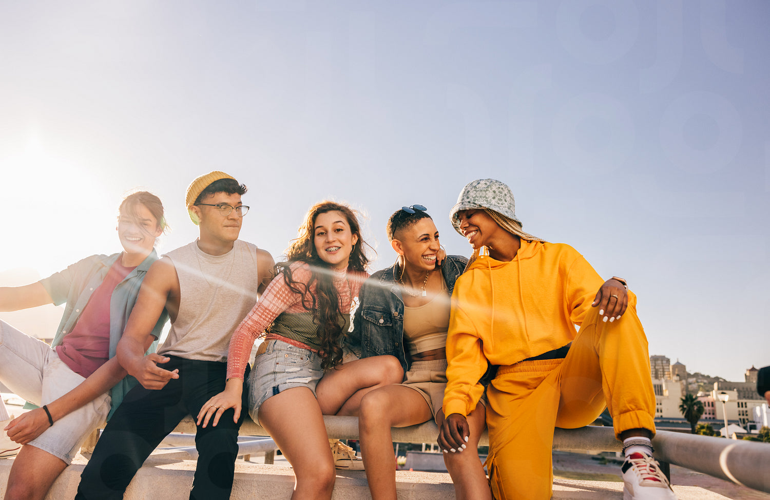 Friends laughing with each other while sitting together in the sun. Happy youngsters having a good time while hanging out in the city. Group of friends making happy memories.