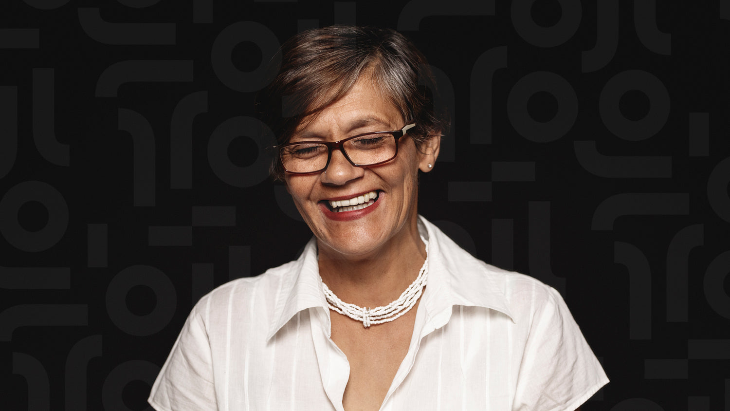Close up of happy senior woman in eyeglasses laughing. Senior woman laughing with eyes closed isolated on black background.